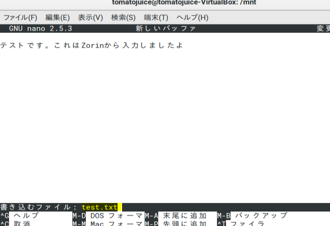 実際にホストOSとゲストOSでフォルダが共有出来てるかどうか確認する為、ターミナルでpicoエディタを管理者権限で起動し、テスト入力&保存。