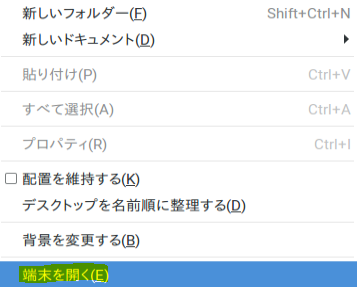 フォルダ作成やマウント作業の為に「右クリックで端末を開く」を選択し、ターミナルを起動する。