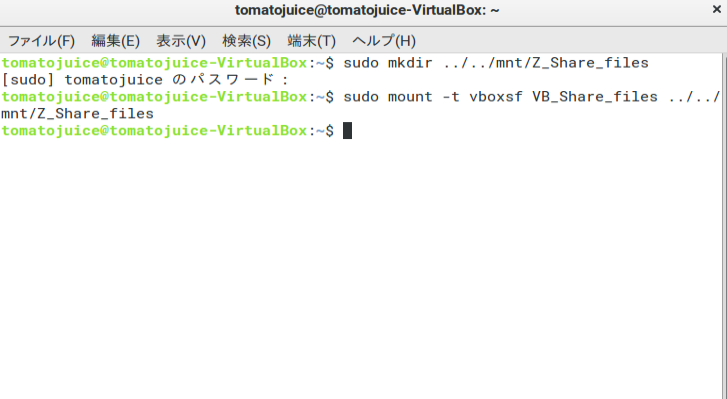 ターミナルに下記を入力し、VirtualBoxで設定した共有フォルダ、「VB_Share_files」をマウント。Linuxでは頻繁にマウントとアンマウント操作が必要になりますからいやでも覚えます。