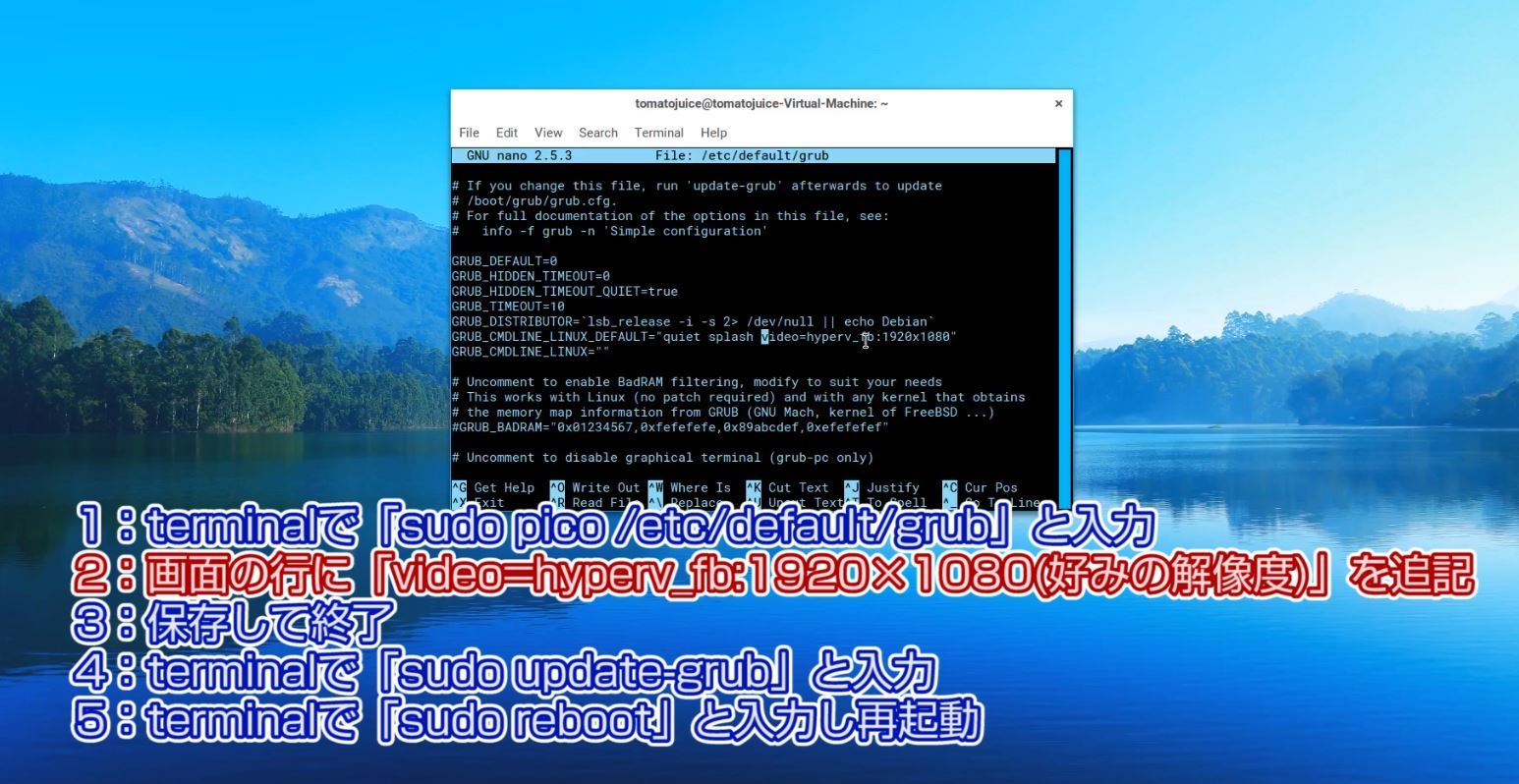 - 画面の行に「video=hyperv_fb:1920×1080(好みの解像度)」を追記
