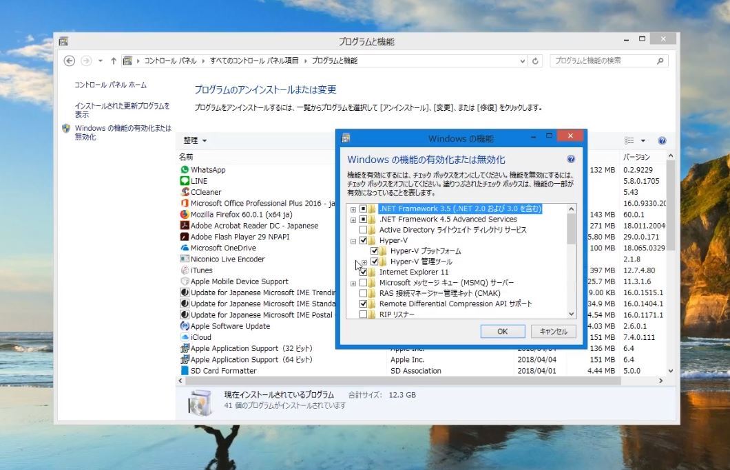 次に、コントロールパネルから「プログラムと機能」をクリックし、Windowsの機能の有効化画面でHyper-Vを有効にする。