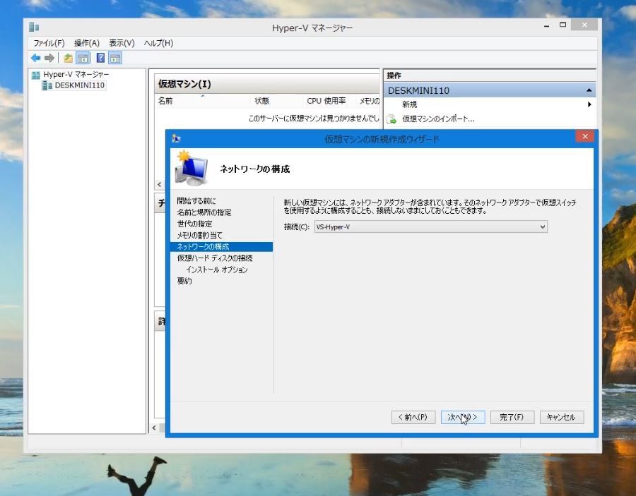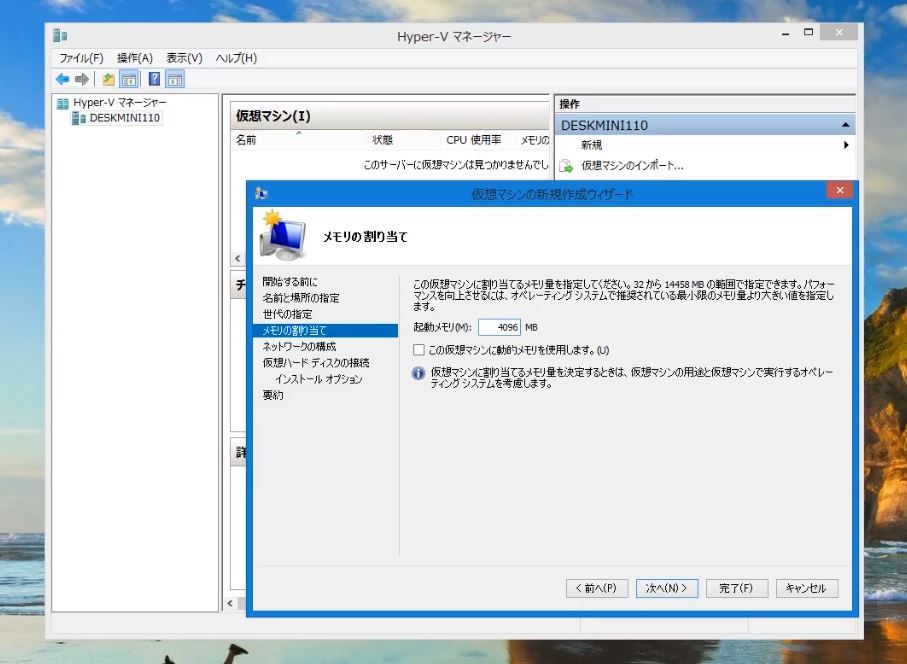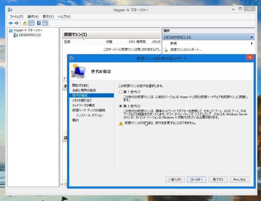 あとはダイアログの指示通りに選択&入力をするだけです。で、ここでは特にフロッピードライブ等のサポートがある第1世代である必要がないので、Hyper-Vは第2世代を選択してます。
