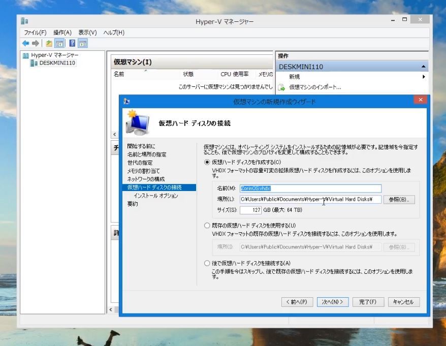 何はともあれHyper-Vを立ち上げ、新規 → 仮想マシンをクリックし、作成!