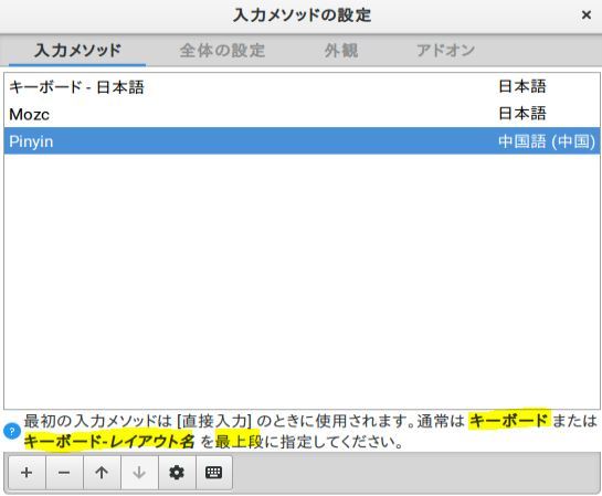 これだけではまだ使えないので、Fcitxの設定から画面キャプチャのように土台となるキーボード配列が上に来るようにし、恐らく自動でインストールされたであろう不要なインプットメソッドは、下の「-」で取り除きます。