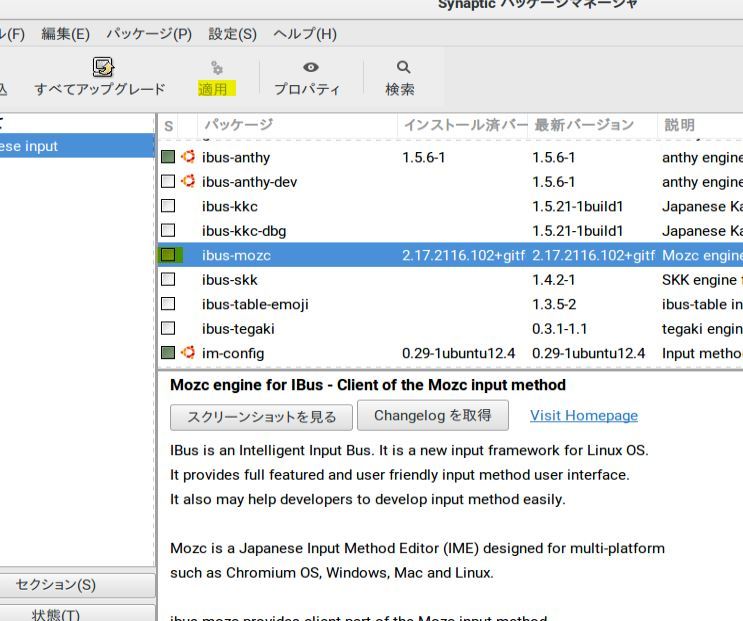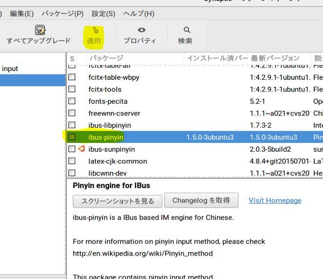 インプットメソッド設定の警告どおり、ibus、fcitx、ximのいずれかの日本語入力メソッドを右クリックしてインストール指定し、適用すると、関連するパッケージも一緒にダウンロードされます。