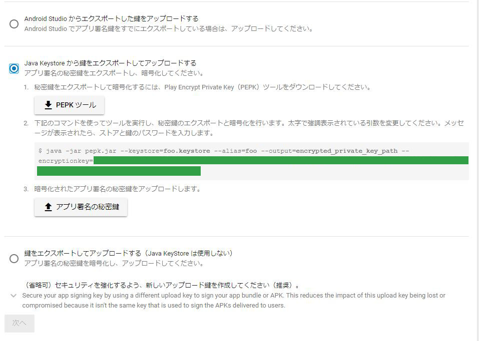 キャプチャの通り、「Google Playによるアプリ署名への登録」のページをスクロールすると、上図が出てきます。