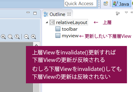 こんな感じ。ペイントViewとは直接関係ない上層のRelativeLayoutをinvalidate()、再描画する事で下層が再描画される。