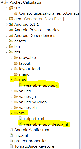 そのapkファイルをHandheld(携帯端末用)の「res/rawフォルダ」へ先に述べた「rawPathResId」で指定した名前、例えば「wearable_app」と指定していたならば、「wearable_app.apk」という名前で保存