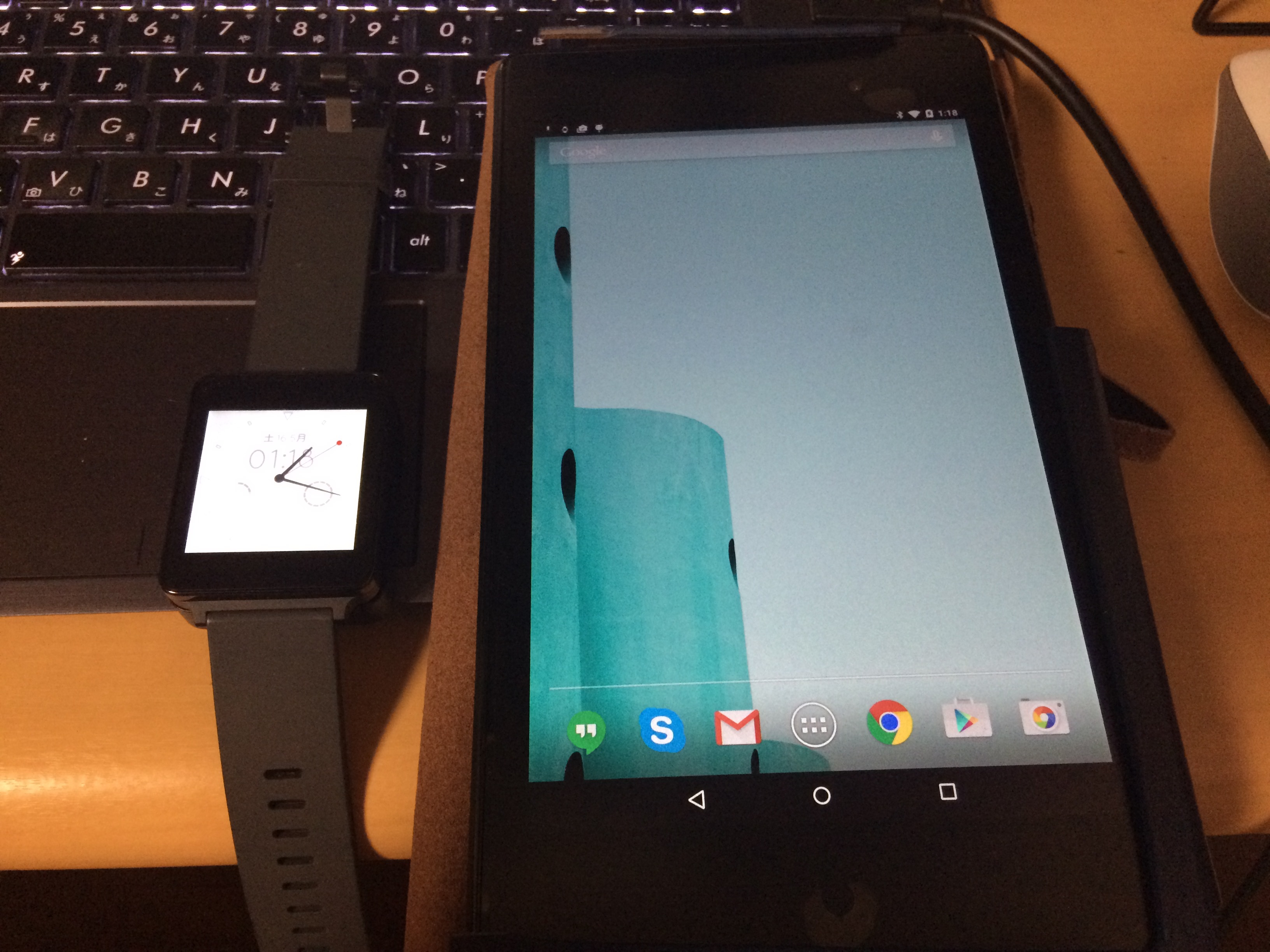 これですね。Android WearはLG G Watch W100で、HandheldはNexus 7 2013です。