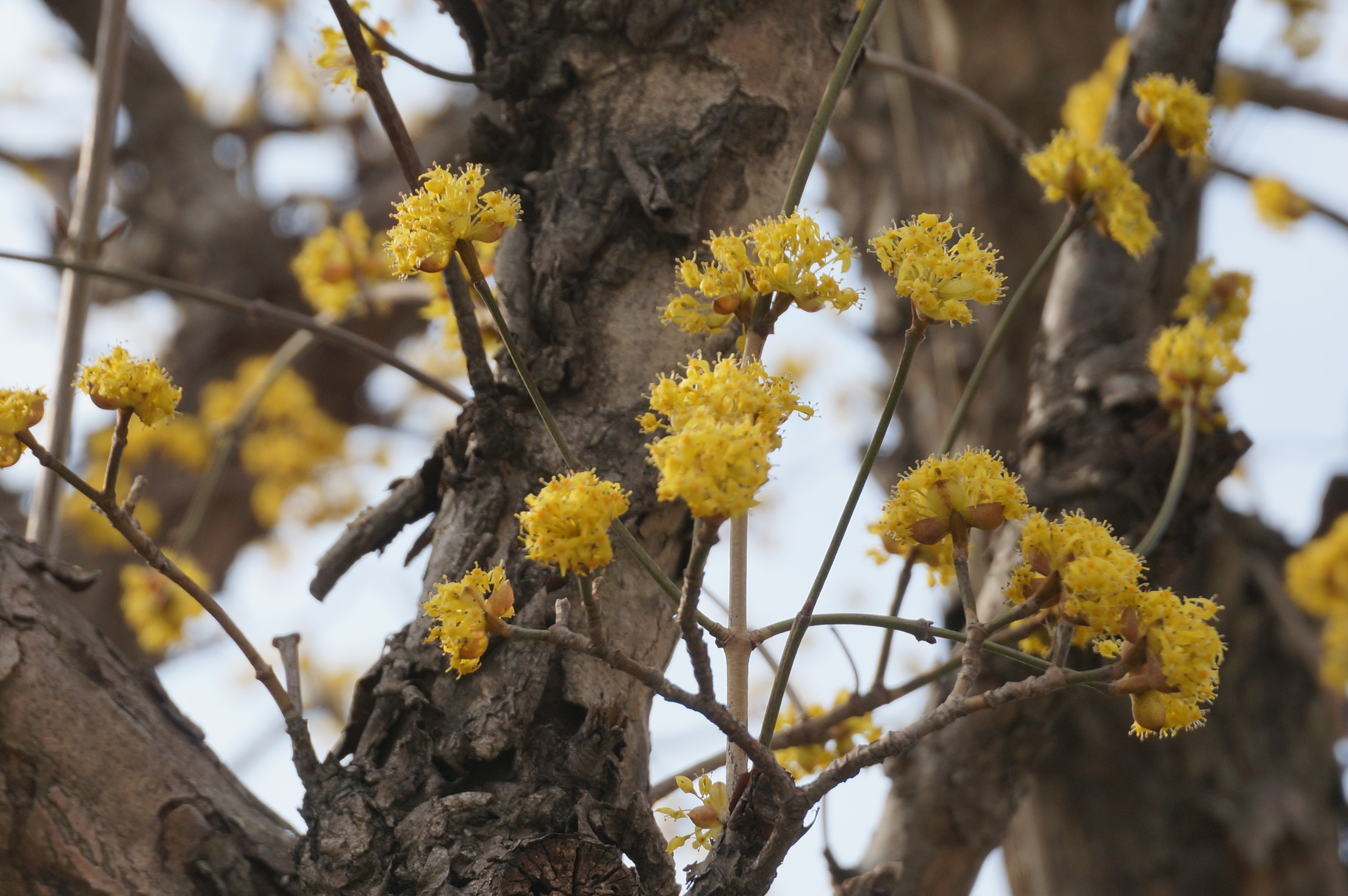 道中に見かけた黄色い花を咲かせる木。よく見かけるけど名前を知らなかったので調べたら、中国原産の山茱萸サンシュユ、shan1 zhu1 yu2。サンシュユで漢字に一発変換!)という木でした。結実した赤い実が漢方薬として利用されてます。