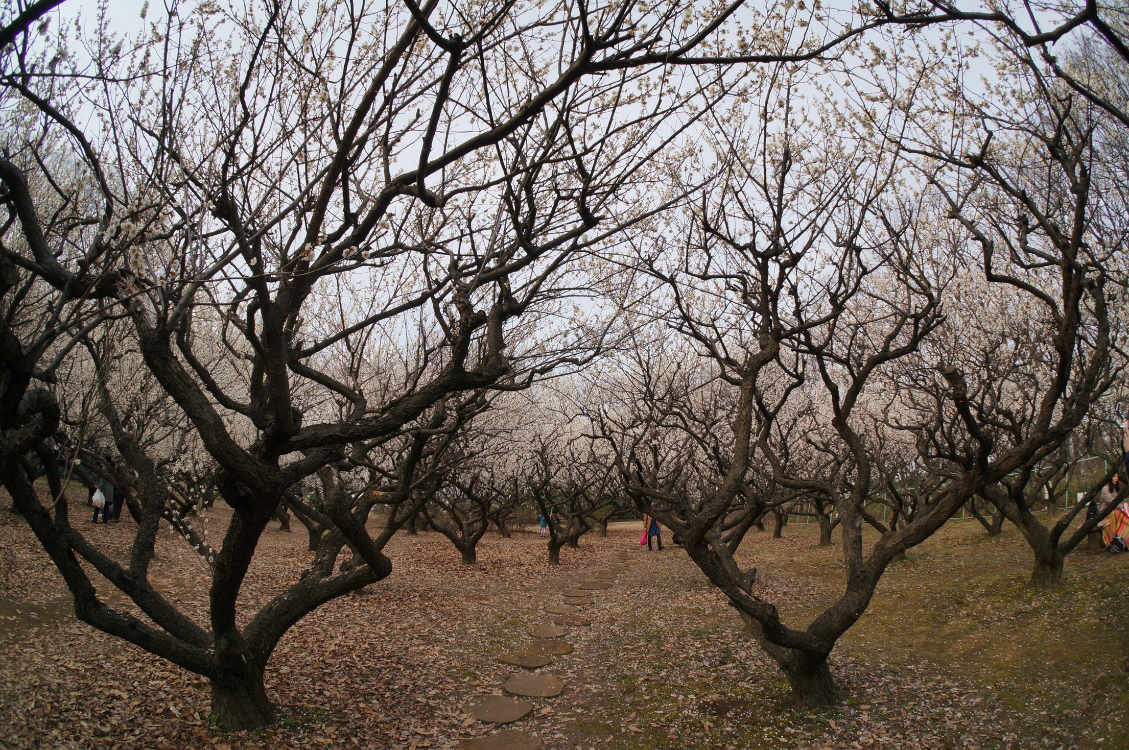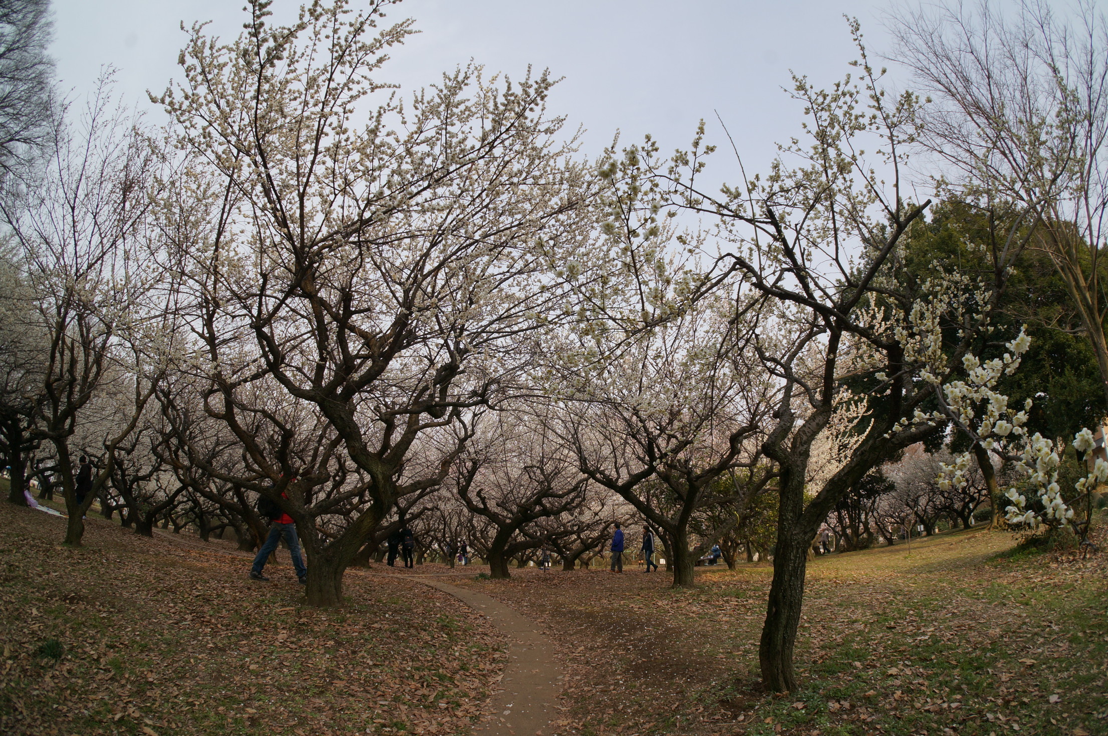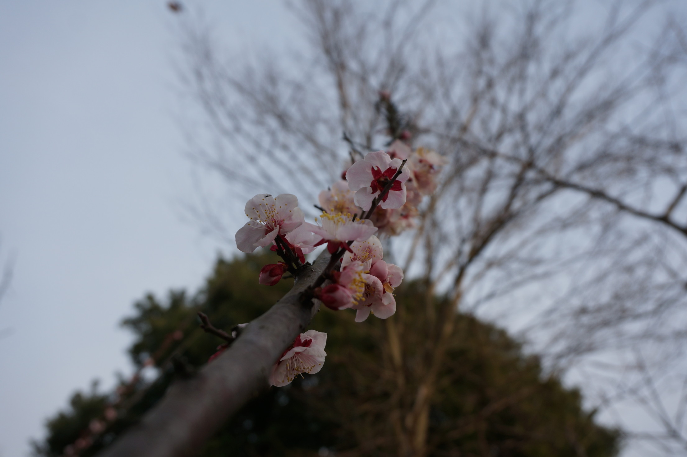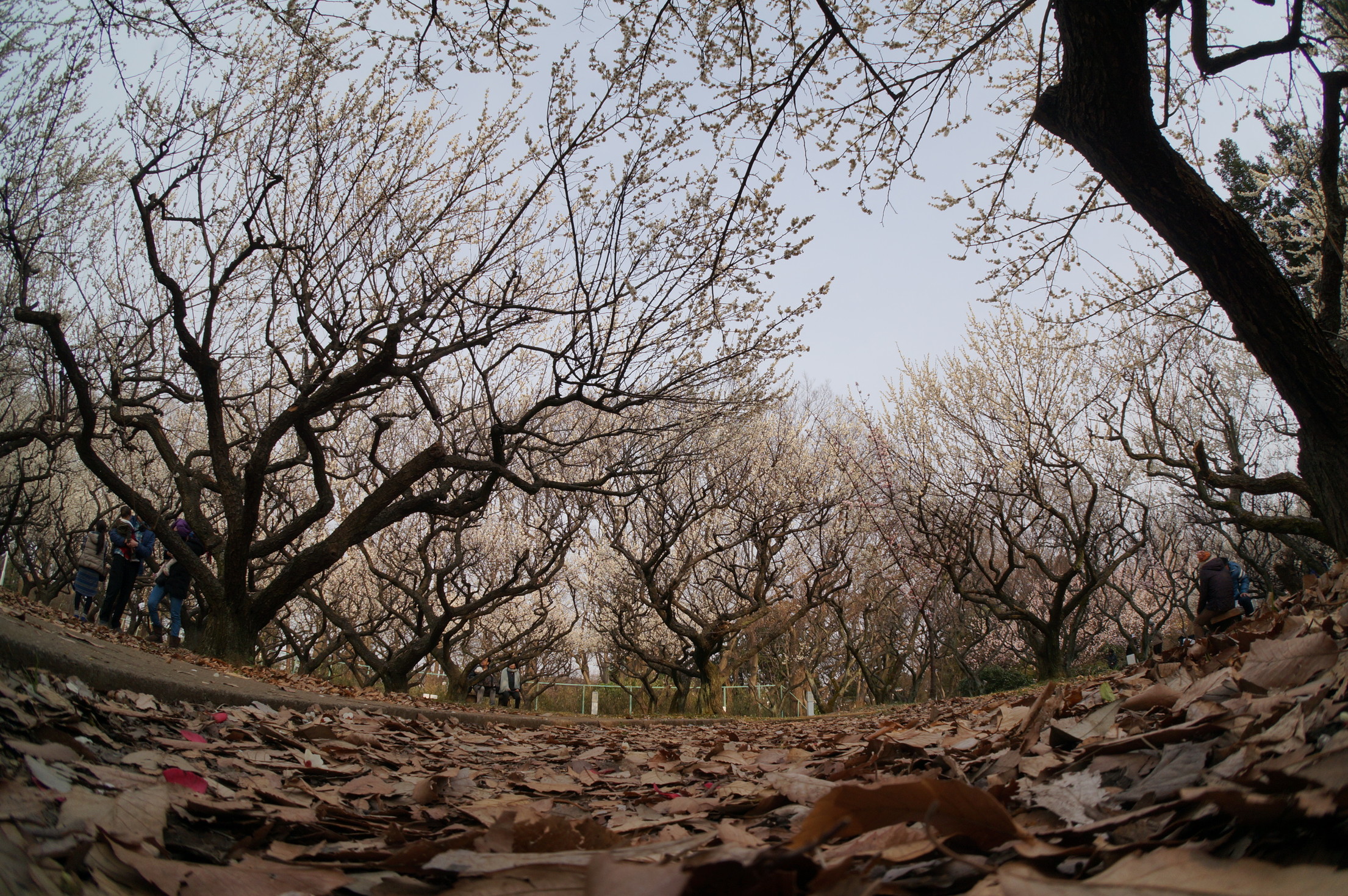 赤塚溜池公園の梅林と梅花を魚眼レンズで撮影