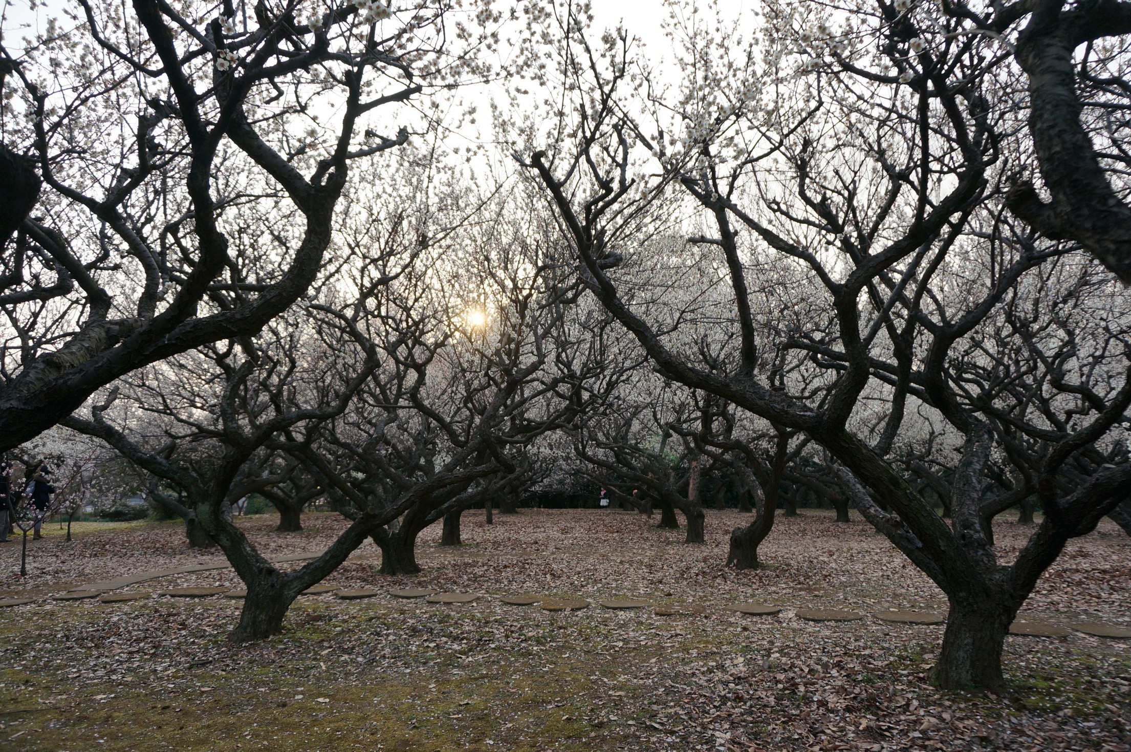 夕暮れ時の赤塚溜池公園の梅林と梅花